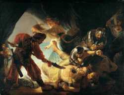 Then, with a fervent prayer that God would strengthen him only this once, to be avenged on the Philistines, he bore with all his might upon the two pillars; they yielded, and the house fell upon the lords and all the people. "So the dead which he slew at his death were more than they which he slew in his life." His brothers and all his family came down and take his body away and buried him between Zorah and Eshtaol in the burying place of Manoah his father.